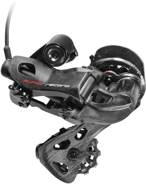 The Campagnolo Super Record EPS 12 speed rear derailleur offers improved shifting performance with a trajectory curve that is optimized for 11-29 and 11-32 cassettes.