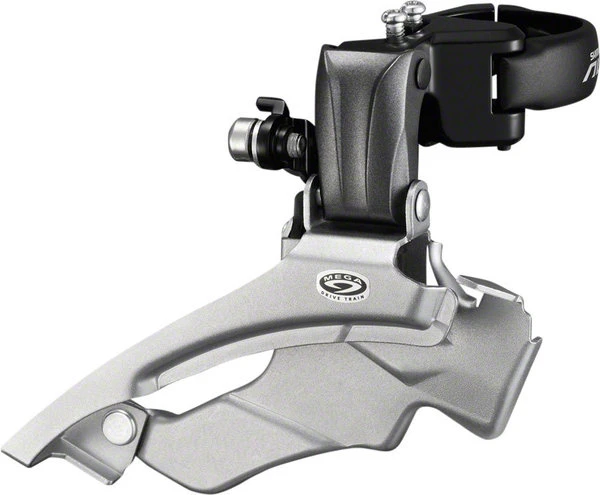 The Shimano Altus 3×9 speed front derailleur offers light action and improved clearance for wide tires and mud.