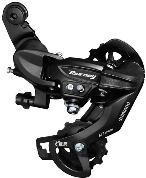 Enjoy quality and reliability with the Shimano Tourney 6/7-speed rear derailleur. It makes use of Shimano SIS, HyperGlide, and Double Servo technologies for smooth, accurate shifts.