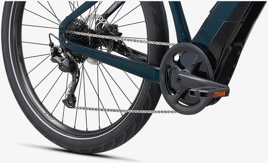 – The Turbo Como’s Specialized 1.2 E motor emphasizes efficiency and range. It’s also fully integrated with the frame and has been custom-tuned for city riding. It intuitively reacts to the force of your pedaling, so the harder you pedal, the more power it delivers. And with an internal belt drive design, it does this without added vibration for the smoothest and most silent ride possible.