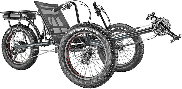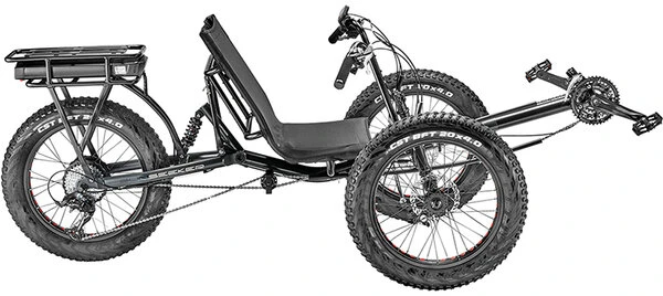 Engineered to incorporate a power system that boasts a 500-watt pedal-assist rear-drive motor, the Sunseeker E-Fat-Tad Electric-Assist Tadpole is ready to take your ride to the next level. Whether it is off-road terrain or smooth roads ahead, the E-Fat-Tad offers 24 speeds, breathable mesh seating, rugged CST 4″ wide tires, and 48 volt / 10.4AH LiOn Battery pack for speeds up to 20 mph.